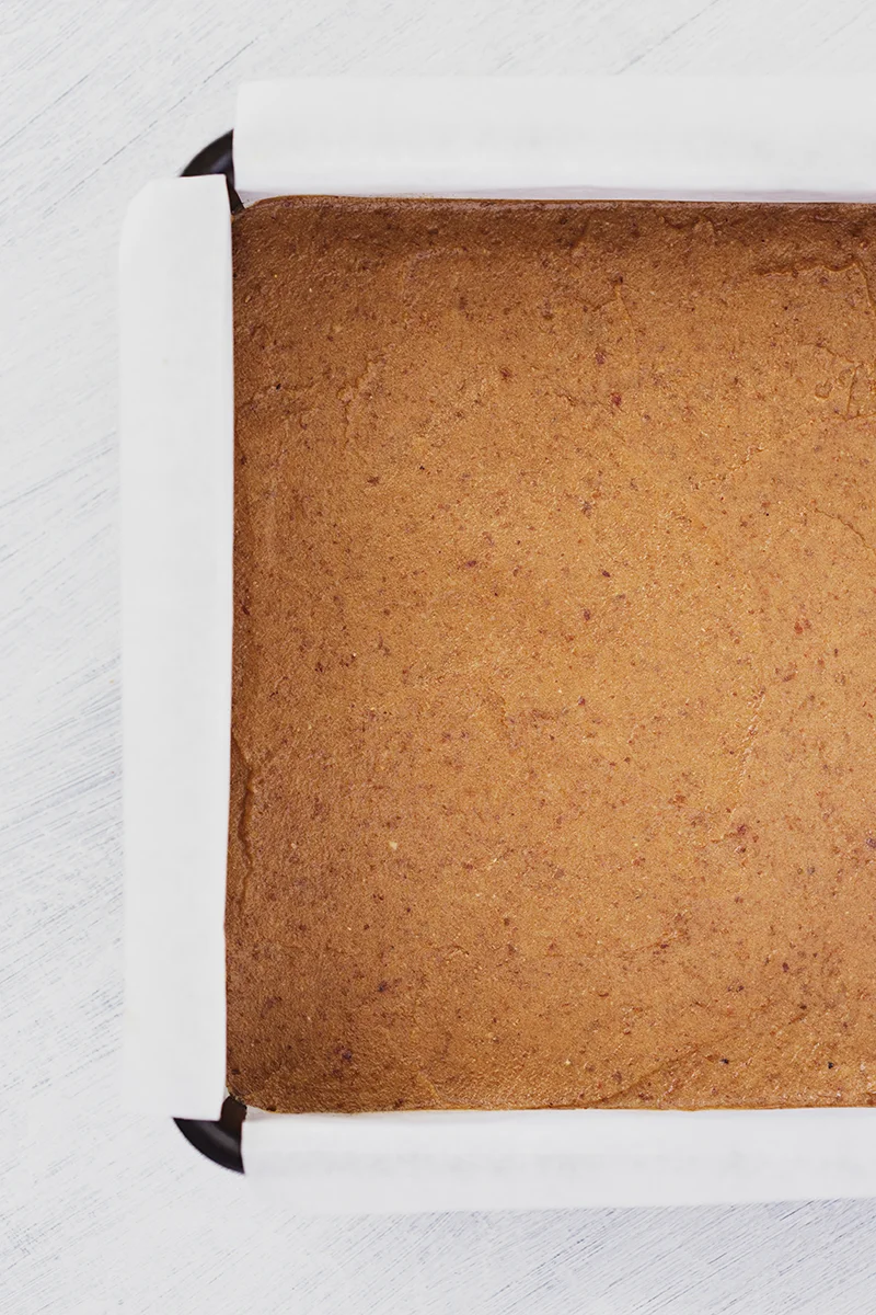 Line an 8" | 20 cm square pan (or a 9" | 23 cm round pan) with parchment paper, pour in the mixture and press it down firmly.