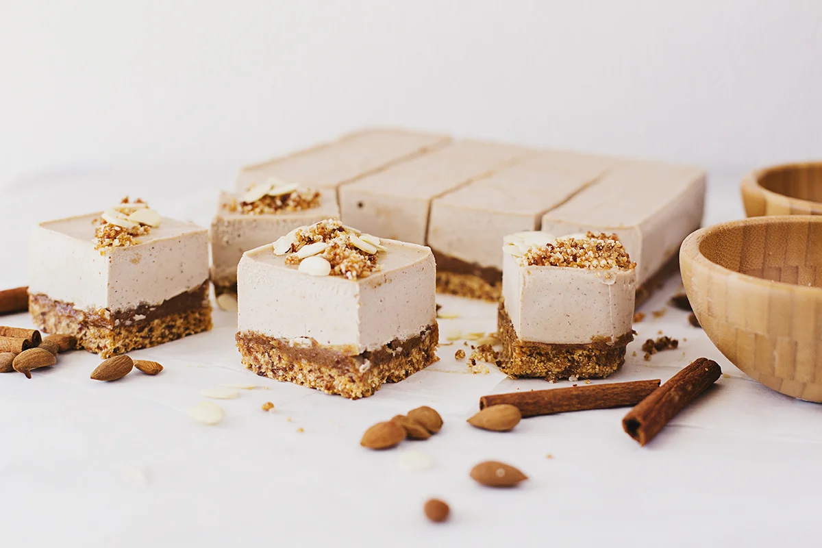 Traditional portuguese sweets around this time of the year are all about this sort of flavours: the warmness of cinnamon, the sweetness of caramel and the toasty flavour of roasted almonds (and chocolate actually, but we're saving that one for some other goodies!). But these desserts could not be further from being healthy (or plant-based, for that matter) and we've had more than enough of that! You can put the dairy and the eggs and the rock hard artificially coloured sugar aside, because this baby right here has everything you could wish for. The almond cinnamon cashew cream tastes like cookies and the salted medjoul date caramel is, well... Salted. Date. Caramel. We threw in some sliced almonds in between layers for some extra crunch and voilá! Best dessert ever. It may involve some soaking and freezing but believe me, this is actually really easy to make and it is worth all the time in the world.